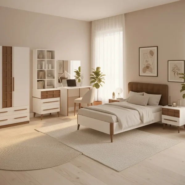 هر یک از اجزای سرویس خواب آراکو با دقت در طراحی و هماهنگی رنگی ساخته شدهاند تا در کنار هم فضایی منظم، زیبا و کارآمد ایجاد کنند. از تخت و کمد تا میز آرایش و کتابخانه، همهی بخشها با رعایت تناسب و جزئیات دقیق طراحی شدهاند تا مجموعهای کامل و هماهنگ برای اتاق خوابهای مدرن فراهم شود.