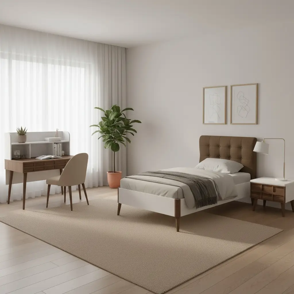 تخت ۱۲۰ سانتیمتر: گزینهای راحتتر برای خواب یکنفره، با ترکیب رنگ سفید و گردویی برای جلوهای گرمتر.