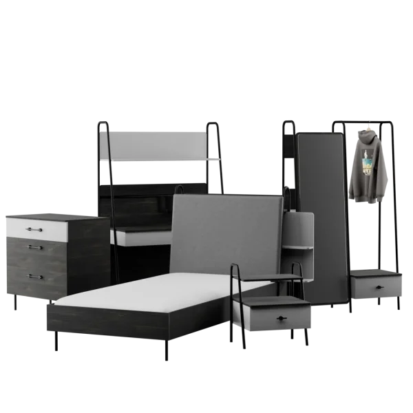 مجموعه کامل سرویس خواب آیرون شامل تختهای ۱۰۰ و ۱۲۰ سانتیمتر، پاتختی، دراور، میز تحریر، فایل ۵ کشو، کتابخانه، کمد دو درب و آیینههای قدی و دیواری است. این ترکیب هماهنگ با طراحی مدرن و متریال مقاوم، فضایی منظم، کاربردی و زیبا در اتاق خواب ایجاد میکند.