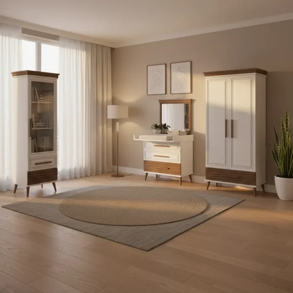 اجزای متنوع شامل تخت چندمنظوره, میز تعویض, آینه و کمدها برای نظمدهی