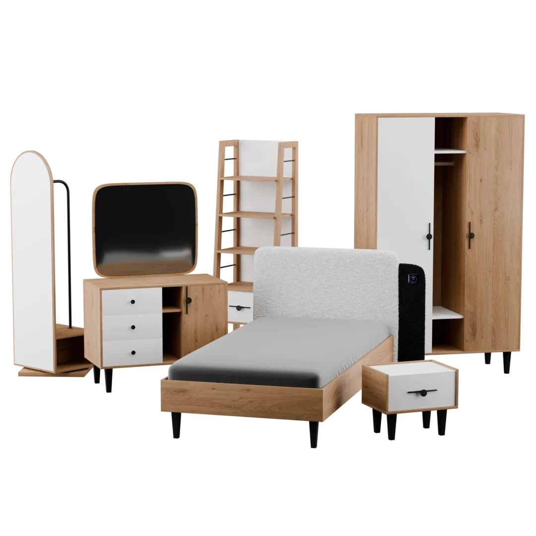 شامل تخت ۱۰۰ و ۱۲۰، کمد دو درب، میز تحریر، میز آرایش، پاتختی، کتابخانه، آیینه دیواری و قدی و باکس دیواری است.