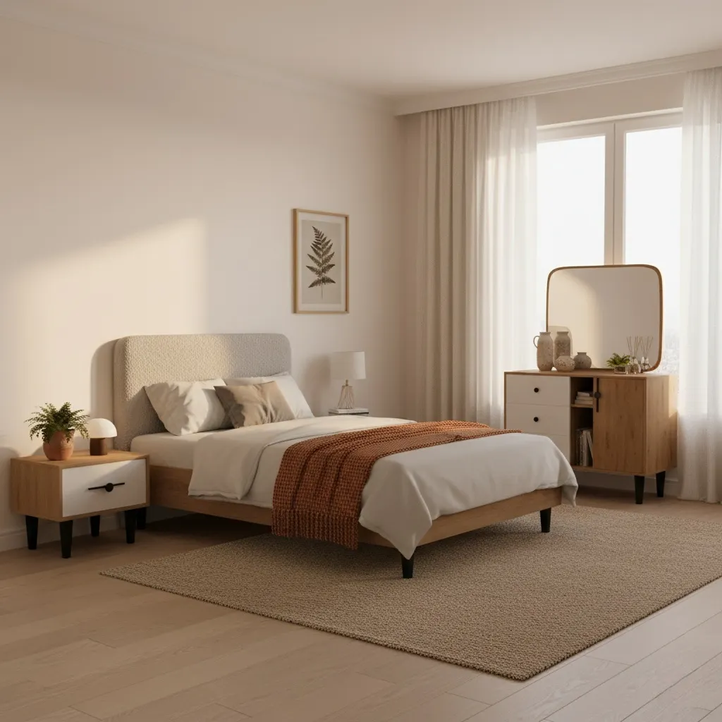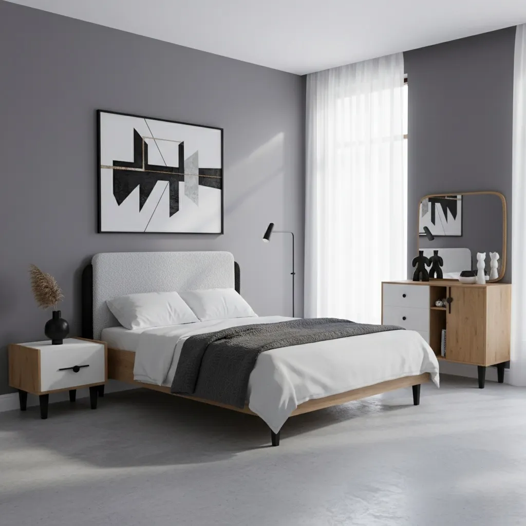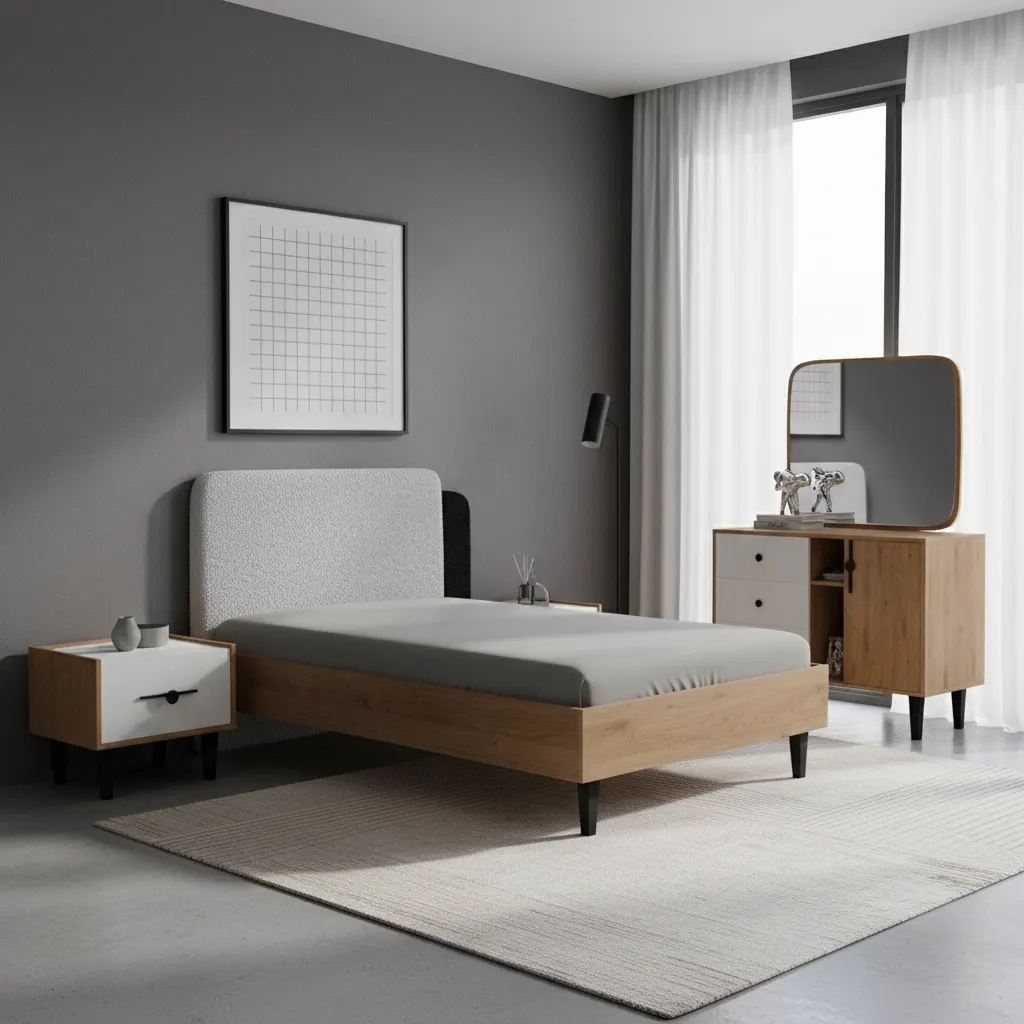 سرویس خواب لوتوس ژیک با سبک مدرن و اسکاندیناوی، ترکیبی از خطوط ساده، رنگ چوب طبیعی و سفید مات است. پایههای فلزی مشکی و سرتخت پارچهای تدی، جلوهای گرم، مینیمال و امروزی به فضا میبخشند.