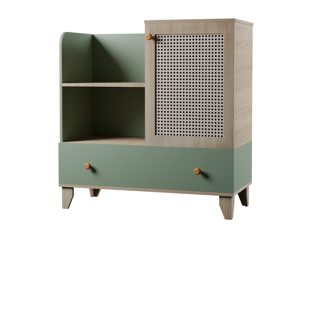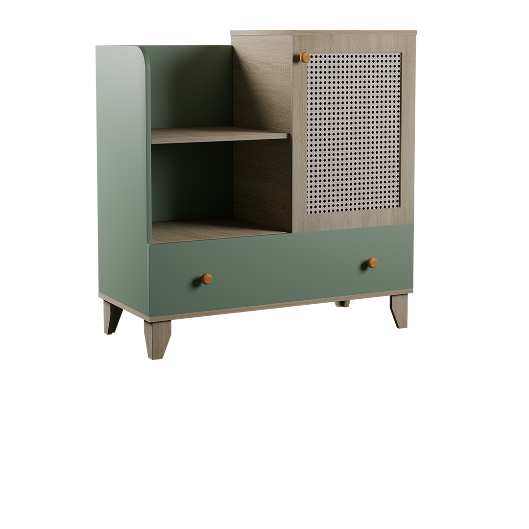 این باکس با طراحی حصیری 8 میل با مقاومت بالا، نهتنها کاربردی بلکه زیباست. ریل و لولاهای آرامبند، دسترسی ایمن و نرم را تضمین میکنند و خطر آسیب به کودک را کاهش میدهند. رنگ سبز و جنس نئوپان M185 پویا، دوام و جذابیت بصری را به ارمغان میآورد.