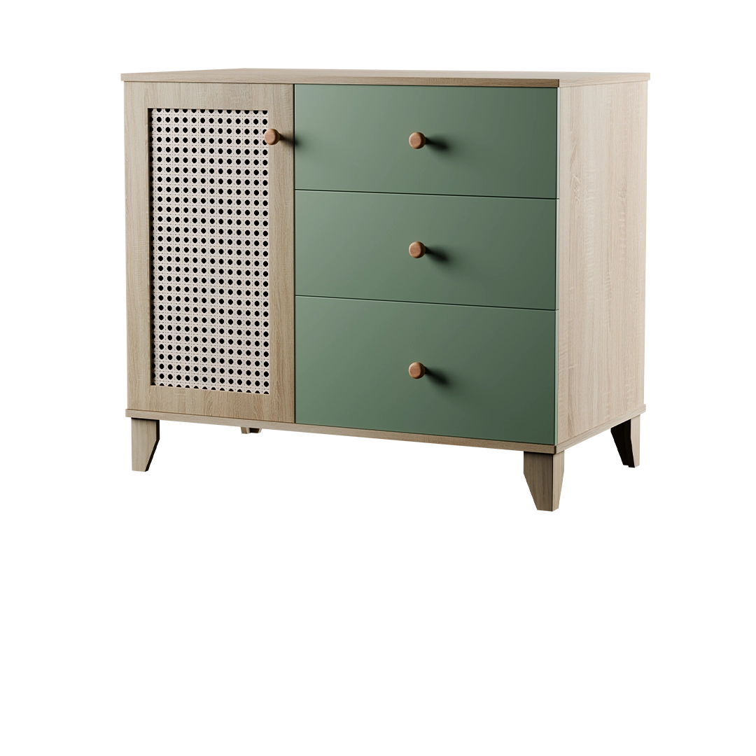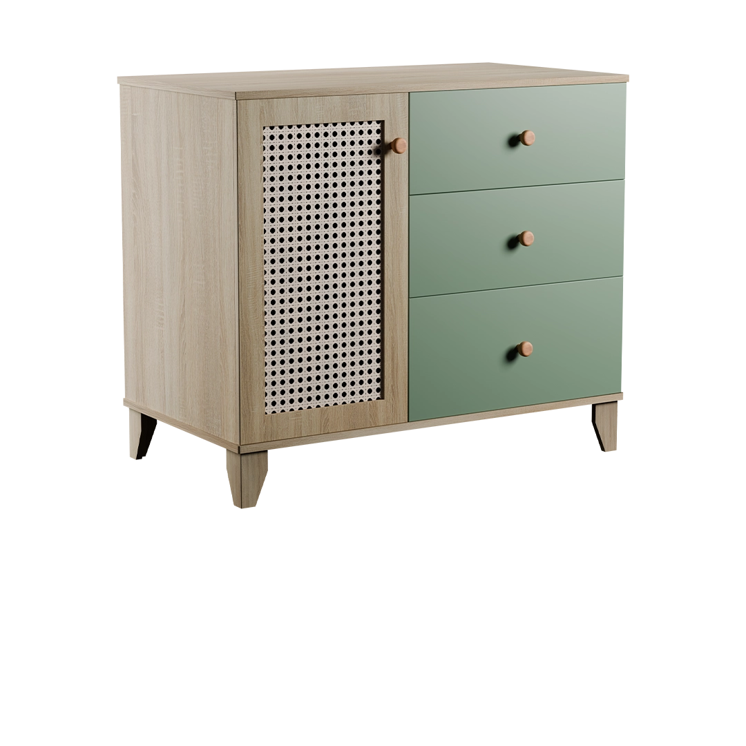میز تعویض لوف نئوپان با هدف ایجاد فضایی آرام و قابلاعتماد برای مراقبت روزانه از نوزاد طراحی شده است. ترکیب بافت حصیری، چوب روشن و سبز مات، حالوهوایی ملایم و صمیمی در اتاق ایجاد میکند؛ فضایی که نه شلوغ است و نه سرد. سه کشوی و یک کمد جانبی، وسایل ضروری را در دسترس نگه میدارند و کمک میکنند همه چیز منظم، تمیز و آماده باشد.