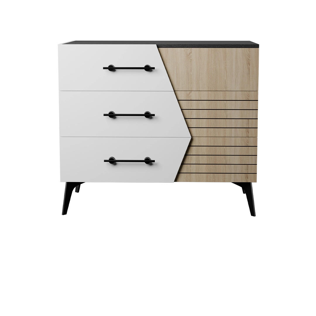 دراور ورنا با طراحی مدرن و رنگهای چوب روشن و سفید، در اتاق خواب، نشیمن یا دفاتر کاری جلوهای منظم و شیک ایجاد میکند. ترکیب خطوط افقی، پایههای فلزی و دستگیرههای مشکی، هماهنگی کامل با دکورهای مدرن دارد.