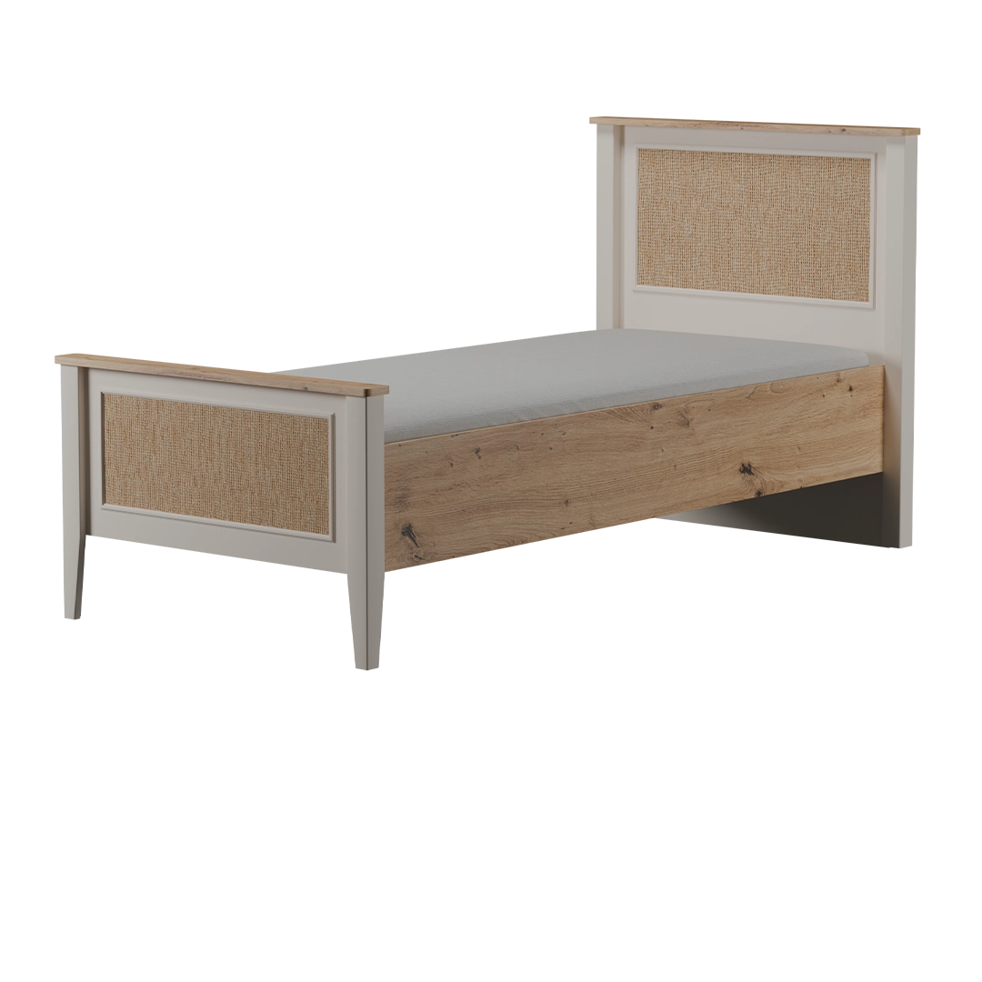 تخت کارولین از MDF با روکش پلیاورتان ساخته شده که دوام و مقاومت بالایی دارد. پایهها و لبهها با رنگ خنثی گرم طراحی شدهاند و سرتخت با طرح حصیری، جلوهای طبیعی دارد.