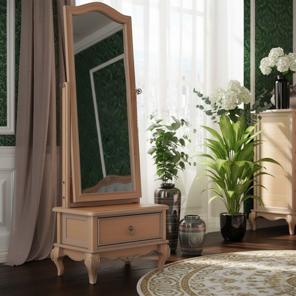 آیینه قدی روکو ژیک با طراحی کلاسیک، قاب چوبی از چوب راش و قابلیت تنظیم زاویه، انتخابی عالی برای فضا های لوکس است. این آینه با پایههای خراطی شده مستحکم و کشوی کاربردی با ریل آرامبند، علاوه بر زیبایی و اصالت، راحتی و کارایی را نیز فراهم میکند. ترکیب متریال باکیفیت و طراحی دقیق، این آینه را به گزینهای ایدهآل برای دکوراسیونهای کلاسیک و نئوکلاسیک تبدیل میکند.