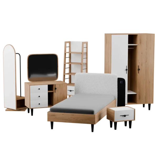 شامل تخت ۱۰۰ و ۱۲۰، کمد دو درب، میز تحریر، میز آرایش، پاتختی، کتابخانه، آیینه دیواری و قدی و باکس دیواری است.