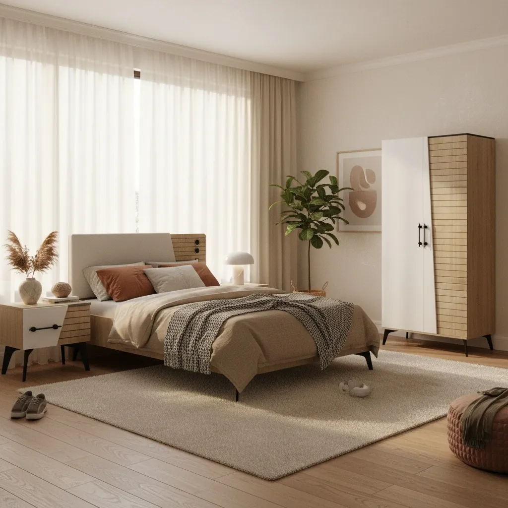 سرویس خواب ورنا از برند ژیک بهدلیل طراحی متعادل و رنگهای خنثی، بهراحتی با سبکهای مختلف دکوراسیون سازگار میشود. ترکیب چوب روشن، سفید مات و جزئیات فلزی مشکی، این مجموعه را به گزینهای انعطافپذیر و مدرن برای هر فضا تبدیل کرده است.